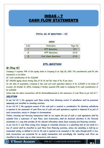 As per Ind AS 7, the aggregate cash flows arising from obtaining control of subsidiaries shall be presented